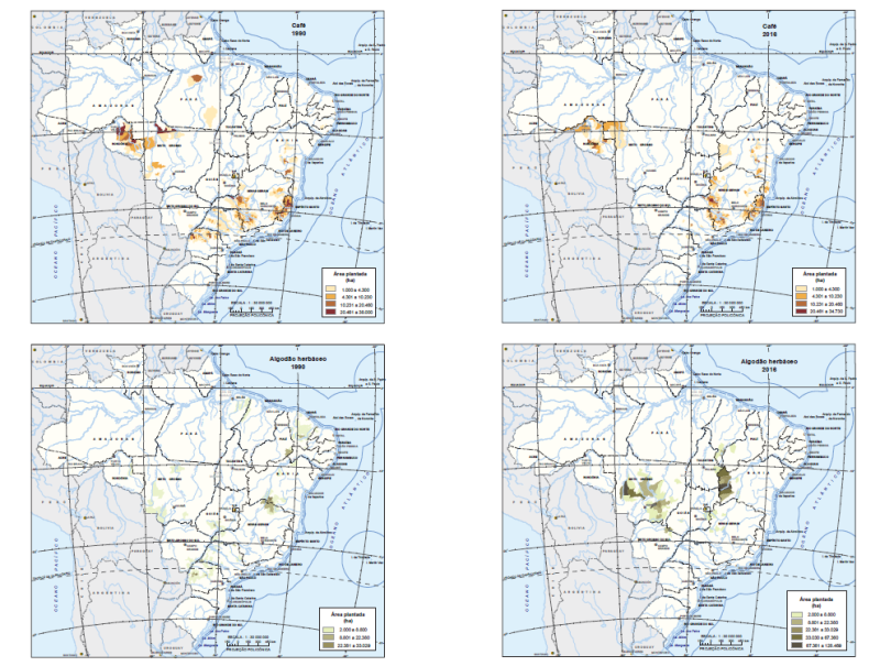 "Conjunto de mapas exibindo a evolução das lavouras de café e algodão nos municípios brasileiros referentes aos anos de 1990 e 2016