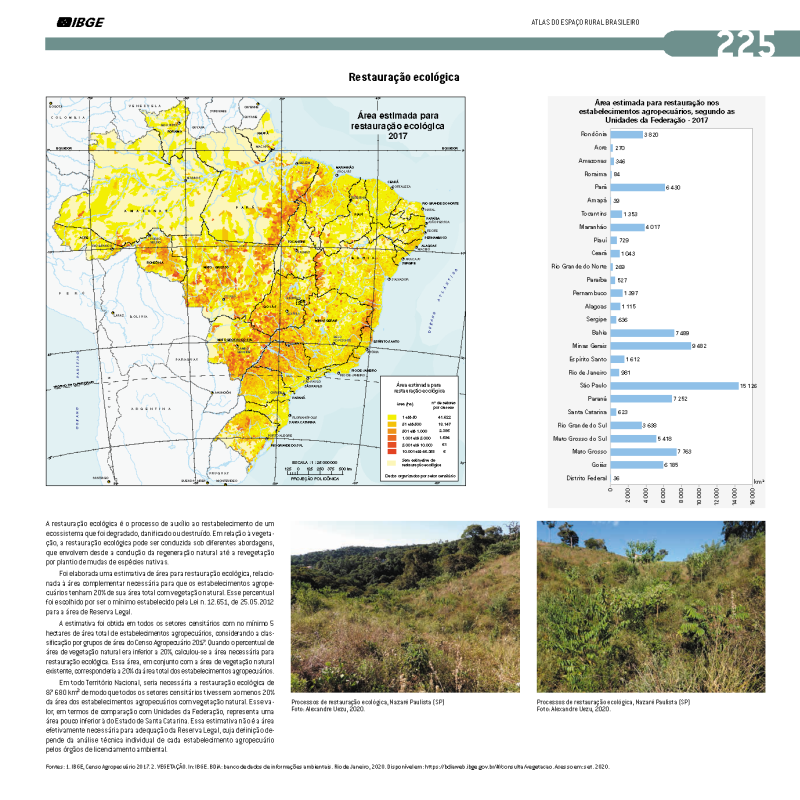 Mapa exibindo a área estimada para restauração ecológica por setor censitário em 2017. Página 225 do capítulo 07 do Atlas do Espaço Rural Brasileiro