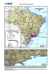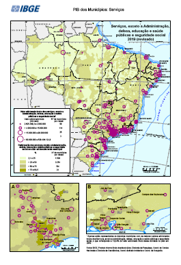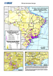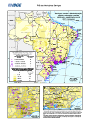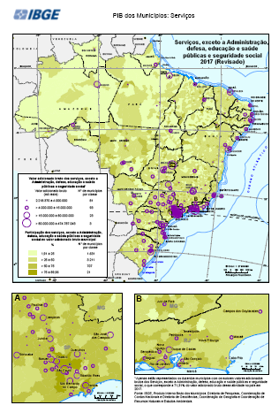"Conjunto de Mapas exibindo a o valor bruto e a participação dos serviços, exceto a administração pública no valor adicionado bruto municipal Estatísticas macroeconômicas. Dados por município. Período de referência 01/01/2017 a 31/12/2017. Inclui Transporte, armazenagem e correio; Alojamento e alimentação; Informação e comunicação; Atividades financeiras, de seguros e serviços relacionados ; atvidades imobiliárias; Atividades profissionais, científicas e técnicas, administrativas e serviços complementares; Educação e saúde privadas; Comércio e reparação de veículos automotores e motocicletas e Outras atividades de serviços Contas Nacionais Periodicidade anual IBGE, Produto Interno Bruto dos Municípios. Diretoria de Pesquisas, Coordenação de Contas Nacionais e Diretoria de Geociências, Coordenação de Geografia. IBGE, Malha Municipal 2018"