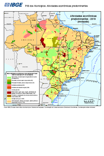 "Mapa exibindo a Maior atividade econômica no total do valor adicionado bruto muncipal Estatísticas macroeconômicas. Dados por município. Período de referência 01/01/2018 a 31/12/2018. Contas Nacionais Periodicidade anual IBGE, Produto Interno Bruto dos Municípios. Diretoria de Pesquisas, Coordenação de Contas Nacionais e Diretoria de Geociências, Coordenação de Meio Ambiente. IBGE, Malha Municipal 2018"