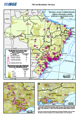 "Conjunto de Mapas exibindo a o valor bruto e a participação dos serviços, exceto a administração pública no valor adicionado bruto municipal Estatísticas macroeconômicas. Dados por município. Período de referência 01/01/2021 a 31/12/2021. Inclui Transporte, armazenagem e correio; Alojamento e alimentação; Informação e comunicação; Atividades financeiras, de seguros e serviços relacionados ; atvidades imobiliárias; Atividades profissionais, científicas e técnicas, administrativas e serviços complementares; Educação e saúde privadas; Comércio e reparação de veículos automotores e motocicletas e Outras atividades de serviços Contas Nacionais Periodicidade anual IBGE, Produto Interno Bruto dos Municípios. Diretoria de Pesquisas, Coordenação de Contas Nacionais e Diretoria de Geociências, Coordenação de Geografia. IBGE, Malha Municipal 2021"