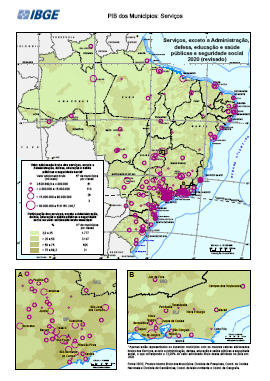 "Conjunto de Mapas exibindo a o valor bruto e a participação dos serviços, exceto a administração pública no valor adicionado bruto municipal Estatísticas macroeconômicas. Dados por município. Período de referência 01/01/2020 a 31/12/2020. Inclui Transporte, armazenagem e correio; Alojamento e alimentação; Informação e comunicação; Atividades financeiras, de seguros e serviços relacionados ; atvidades imobiliárias; Atividades profissionais, científicas e técnicas, administrativas e serviços complementares; Educação e saúde privadas; Comércio e reparação de veículos automotores e motocicletas e Outras atividades de serviços Contas Nacionais Periodicidade anual IBGE, Produto Interno Bruto dos Municípios. Diretoria de Pesquisas, Coordenação de Contas Nacionais e Diretoria de Geociências, Coordenação de Geografia. IBGE, Malha Municipal 2020"