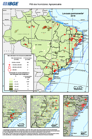 "Conjunto de Mapas exibindo a o valor bruto e a participação do cultivo da lavoura permanente no valor adicionado bruto municipal Estatísticas macroeconômicas. Dados por município. Período de referência 01/01/2019 a 31/12/2019. Compreende as atividades: Cultivo de laranja, Cultivo de café e Cultivo de outros produtos da lavoura permanente Contas Nacionais Periodicidade anual IBGE, Produto Interno Bruto dos Municípios. Diretoria de Pesquisas, Coordenação de Contas Nacionais e Diretoria de Geociências, Coordenação de Geografia. IBGE, Malha Municipal 2018"