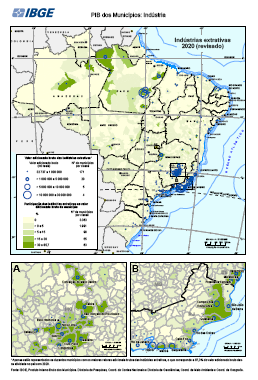 "Conjunto de Mapas exibindo a o valor bruto e a participação da indústria extrativa no valor adicionado bruto municipal Estatísticas macroeconômicas. Dados por município. Período de referência 01/01/2020 a 31/12/2020. Contas Nacionais Periodicidade anual IBGE, Produto Interno Bruto dos Municípios. Diretoria de Pesquisas, Coordenação de Contas Nacionais e Diretoria de Geociências, Coordenação de Geografia. IBGE, Malha Municipal 2020"