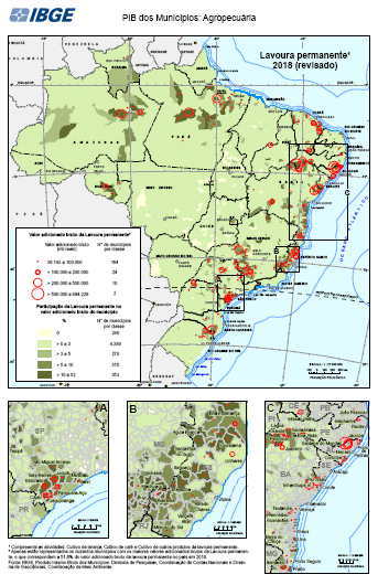 "Conjunto de Mapas exibindo a o valor bruto e a participação do cultivo da lavoura permanente no valor adicionado bruto municipal Estatísticas macroeconômicas. Dados por município. Período de referência 01/01/2018 a 31/12/2018. Compreende as atividades: Cultivo de laranja, Cultivo de café e Cultivo de outros produtos da lavoura permanente Contas Nacionais Periodicidade anual IBGE, Produto Interno Bruto dos Municípios. Diretoria de Pesquisas, Coordenação de Contas Nacionais e Diretoria de Geociências, Coordenação de Meio Ambiente. IBGE, Malha Municipal 2018"