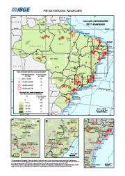 "Conjunto de Mapas exibindo a o valor bruto e a participação do cultivo da lavoura permanente no valor adicionado bruto municipal Estatísticas macroeconômicas. Dados por município. Período de referência 01/01/2017 a 31/12/2017. Compreende as atividades: Cultivo de laranja, Cultivo de café e Cultivo de outros produtos da lavoura permanente Contas Nacionais Periodicidade anual IBGE, Produto Interno Bruto dos Municípios. Diretoria de Pesquisas, Coordenação de Contas Nacionais e Diretoria de Geociências, Coordenação de Geografia. IBGE, Malha Municipal 2018"
