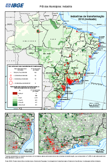 "Conjunto de Mapas exibindo a o valor bruto e a participação da indústria de transformação no valor adicionado bruto municipal Estatísticas macroeconômicas. Dados por município. Período de referência 01/01/2018 a 31/12/2018. Contas Nacionais Periodicidade anual IBGE, Produto Interno Bruto dos Municípios. Diretoria de Pesquisas, Coordenação de Contas Nacionais e Diretoria de Geociências, Coordenação de Meio Ambiente. IBGE, Malha Municipal 2018"