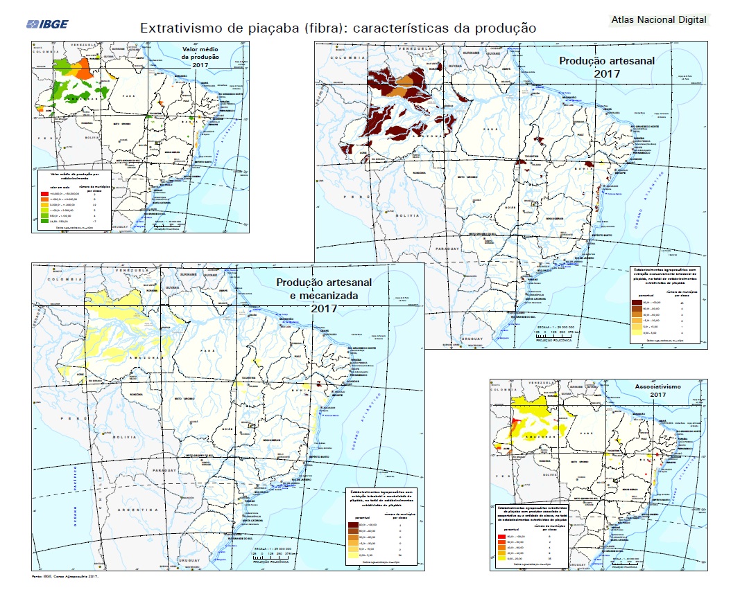 O conjunto de mapas apresenta os dados de extrativismo de piaçaba segundo características da produção. Faz parte da publicação Atlas Nacional Digital do Brasil 2022 que tem como objetivo principal o entendimento, em um sentido amplo, dos processos estruturantes do espaço geográfico brasileiro, através da atualização do Atlas Nacional do Brasil Milton Santos 2010. Neste contexto, a abrangência do temário proposto, incluindo o presente mapeamento, é resultado da valiosa contribuição das fontes oriundas do próprio IBGE e de outras instituições públicas e privadas, sem as quais o Atlas Nacional Digital do Brasil 2022 não daria conta da complexa articulação de temas que envolvem a atualização do conhecimento do território brasileiro.