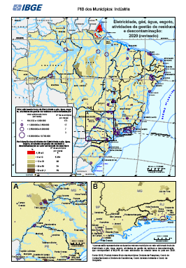 Conjunto de Mapas exibindo a o valor bruto e a participação das atividades de eletricidade e gás, água, esgoto, atividades de gestão de resíduos e descontaminação no valor adicionado bruto municipal Estatísticas macroeconômicas. Dados por município. Período de referência 01/01/2016 a 31/12/2016. Contas Nacionais Dados revisados pela coordenação de Contas Nacionais em dezembro de 2019 Periodicidade anual IBGE, Produto Interno Bruto dos Municípios. Diretoria de Pesquisas, Coordenação de Contas Nacionais e Diretoria de Geociências, Coordenação de Geografia. IBGE, Malha Municipal 2018