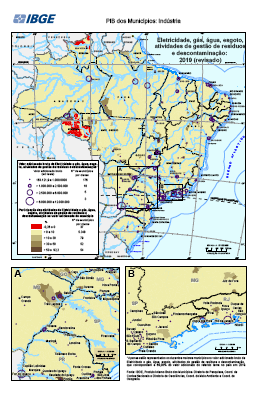 "Conjunto de Mapas exibindo a o valor bruto e a participação das atividades de eletricidade e gás, água, esgoto, atividades de gestão de resíduos e descontaminação no valor adicionado bruto municipal Estatísticas macroeconômicas. Dados por município. Período de referência 01/01/2019 a 31/12/2019. Contas Nacionais Periodicidade anual IBGE, Produto Interno Bruto dos Municípios. Diretoria de Pesquisas, Coordenação de Contas Nacionais e Diretoria de Geociências, Coordenação de Geografia. IBGE, Malha Municipal 2018"