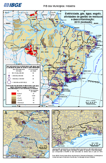 "Conjunto de Mapas exibindo a o valor bruto e a participação das atividades de eletricidade e gás, água, esgoto, atividades de gestão de resíduos e descontaminação no valor adicionado bruto municipal Estatísticas macroeconômicas. Dados por município. Período de referência 01/01/2017 a 31/12/2017. Contas Nacionais Periodicidade anual IBGE, Produto Interno Bruto dos Municípios. Diretoria de Pesquisas, Coordenação de Contas Nacionais e Diretoria de Geociências, Coordenação de Geografia. IBGE, Malha Municipal 2018"