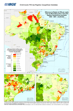 "Mapa comparando a diferença da razão do PIB per capita dos municípios polo das Regiões Geográficas Imediatas ante o PIB per capita do Brasil em 2019 e a razão do PIB per capita do mesmo município ante o PIB per capita do Brasil em 2002 com a diferença da razão do PIB per capita do agregado dos municípios de entorno das Regiões Geográficas Imediatas ante o PIB per capita do Brasil em 2019 e a razão do PIB per capita do mesmo grupo de municípios ante o PIB per capita do Brasil em 2002 em número índice (PIB per capita do Brasil = 100) Estatísticas macroeconômicas. Dados por Municípios polo e municípios de entorno nas Regiões Geográficas Imediatas. Períodos de referência 01/01/2002 a 31/12/2002 e 01/01/2019 a 31/12/2019. Para o cálculo foi utilizada a População residente estimada para 1º de julho de 2002 e 2019, segundo os municípios, enviada ao Tribunal de Contas da União – TCU. Dados em R$ por pessoa Contas Nacionais região geográfica imediata Recorte geográfico que reúne um conjunto de municípios, sendo um deles – ou mais do que um, no caso de arranjo populacional – o polo. Periodicidade anual IBGE, Produto Interno Bruto dos Municípios. Diretoria de Pesquisas, Coordenação de Contas Nacionais e Diretoria de Geociências, Coordenação de Geografia. IBGE, Malha Municipal 2018"