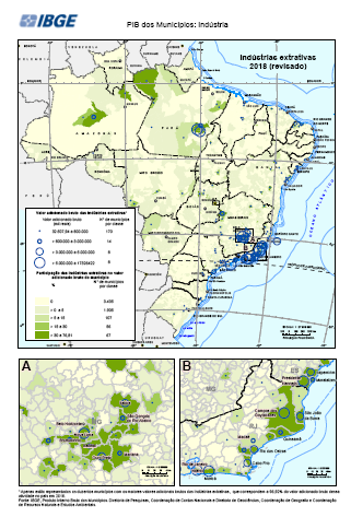 "Conjunto de Mapas exibindo a o valor bruto e a participação da indústria extrativa no valor adicionado bruto municipal Estatísticas macroeconômicas. Dados por município. Período de referência 01/01/2018 a 31/12/2018. Contas Nacionais Periodicidade anual IBGE, Produto Interno Bruto dos Municípios. Diretoria de Pesquisas, Coordenação de Contas Nacionais e Diretoria de Geociências, Coordenação de Geografia. IBGE, Malha Municipal 2018"