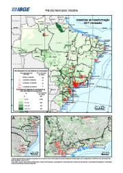 "Conjunto de Mapas exibindo a o valor bruto e a participação da indústria de transformação no valor adicionado bruto municipal Estatísticas macroeconômicas. Dados por município. Período de referência 01/01/2017 a 31/12/2017. Contas Nacionais Periodicidade anual IBGE, Produto Interno Bruto dos Municípios. Diretoria de Pesquisas, Coordenação de Contas Nacionais e Diretoria de Geociências, Coordenação de Geografia. IBGE, Malha Municipal 2018"