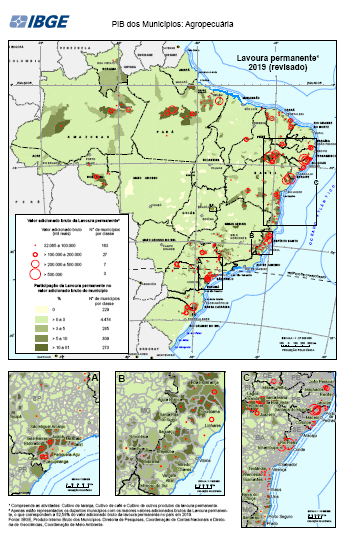 "Conjunto de Mapas exibindo a o valor bruto e a participação do cultivo da lavoura permanente no valor adicionado bruto municipal Estatísticas macroeconômicas. Dados por município. Período de referência 01/01/2019 a 31/12/2019. Compreende as atividades: Cultivo de laranja, Cultivo de café e Cultivo de outros produtos da lavoura permanente Contas Nacionais Periodicidade anual IBGE, Produto Interno Bruto dos Municípios. Diretoria de Pesquisas, Coordenação de Contas Nacionais e Diretoria de Geociências, Coordenação de Meio Ambiente. IBGE, Malha Municipal 2019"