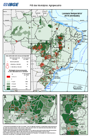 "Conjunto de Mapas exibindo a o valor bruto e a participação do cultivo da lavoura temporária no valor adicionado bruto municipal Estatísticas macroeconômicas. Dados por município. Período de referência 01/01/2019 a 31/12/2019. Compreende as atividades: Cultivo de cereais, Cultivo de algodão herbáceo e outras fibras da lavoura temporária, Cultivo de cana-de-açúcar, Cultivo de fumo, Cultivo de soja e Cultivo de outras lavouras temporárias não especificadas anteriormente e serviços relacionados à agricultura Contas Nacionais Periodicidade anual IBGE, Produto Interno Bruto dos Municípios. Diretoria de Pesquisas, Coordenação de Contas Nacionais e Diretoria de Geociências, Coordenação de Meio Ambiente. IBGE, Malha Municipal 2019"