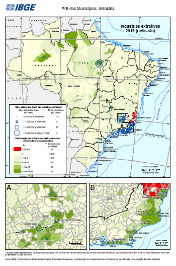 "Conjunto de Mapas exibindo a o valor bruto e a participação da indústria extrativa no valor adicionado bruto municipal Estatísticas macroeconômicas. Dados por município. Período de referência 01/01/2019 a 31/12/2019. Contas Nacionais Periodicidade anual IBGE, Produto Interno Bruto dos Municípios. Diretoria de Pesquisas, Coordenação de Contas Nacionais e Diretoria de Geociências, Coordenação de Meio Ambiente. IBGE, Malha Municipal 2019"