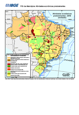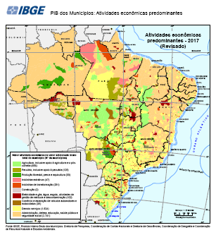 "Mapa exibindo a Maior atividade econômica no total do valor adicionado bruto muncipal Estatísticas macroeconômicas. Dados por município. Período de referência 01/01/2017 a 31/12/2017. Contas Nacionais Periodicidade anual IBGE, Produto Interno Bruto dos Municípios. Diretoria de Pesquisas, Coordenação de Contas Nacionais e Diretoria de Geociências, Coordenação de Geografia. IBGE, Malha Municipal 2018"