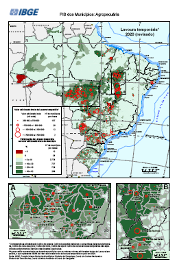 "Conjunto de Mapas exibindo a o valor bruto e a participação do cultivo da lavoura temporária no valor adicionado bruto municipal Estatísticas macroeconômicas. Dados por município. Período de referência 01/01/2020 a 31/12/2020. Compreende as atividades: Cultivo de cereais, Cultivo de algodão herbáceo e outras fibras da lavoura temporária, Cultivo de cana-de-açúcar, Cultivo de fumo, Cultivo de soja e Cultivo de outras lavouras temporárias não especificadas anteriormente e serviços relacionados à agricultura Contas Nacionais Periodicidade anual IBGE, Produto Interno Bruto dos Municípios. Diretoria de Pesquisas, Coordenação de Contas Nacionais e Diretoria de Geociências, Coordenação de Geografia. IBGE, Malha Municipal 2020"