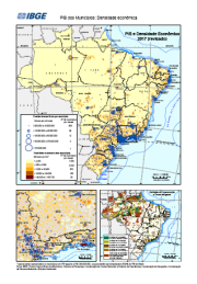 "Mapa exibindo a Densidade econômica municipal: PIB municipal / Km² (valores em mil Reais) e o PIB dos municípios em valores absolutos (mil Reas) Estatísticas macroeconômicas. Dados por município. Período de referência 01/01/2017 a 31/12/2017. Contas Nacionais Periodicidade anual IBGE, Produto Interno Bruto dos Municípios. Diretoria de Pesquisas, Coordenação de Contas Nacionais e Diretoria de Geociências, Coordenação de Geografia. IBGE, Malha Municipal 2018"