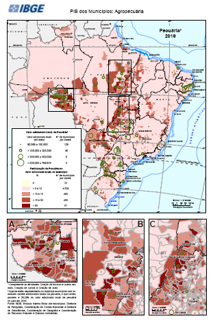 "Conjunto de Mapas exibindo a o valor bruto e a participação da criação de bovinos e outros animais, de suínos e de aves no valor adicionado bruto municipal Estatísticas macroeconômicas. Dados por município. Período de referência 01/01/2019 a 31/12/2019. Compreende as atividades: Criação de bovinos e outros animais, Criação de suínos e Criação de aves. Contas Nacionais Periodicidade anual IBGE, Produto Interno Bruto dos Municípios. Diretoria de Pesquisas, Coordenação de Contas Nacionais e Diretoria de Geociências, Coordenação de Geografia. IBGE, Malha Municipal 2018"