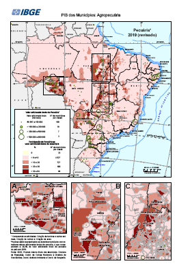 "Conjunto de Mapas exibindo a o valor bruto e a participação da criação de bovinos e outros animais, de suínos e de aves no valor adicionado bruto municipal Estatísticas macroeconômicas. Dados por município. Período de referência 01/01/2019 a 31/12/2019. Compreende as atividades: Criação de bovinos e outros animais, Criação de suínos e Criação de aves. Contas Nacionais Periodicidade anual IBGE, Produto Interno Bruto dos Municípios. Diretoria de Pesquisas, Coordenação de Contas Nacionais e Diretoria de Geociências, Coordenação de Geografia. IBGE, Malha Municipal 2019"