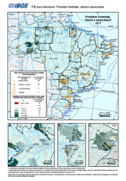 "Conjunto de Mapas exibindo a o valor bruto e a participação da pesca, aquicultura e serviços relacionados, e da silvicultura, extração vegetal e serviços no valor adicionado bruto municipal Estatísticas macroeconômicas. Dados por município. Período de referência 01/01/2019 a 31/12/2019. Compreende as atividades: Silvicultura, extração vegetal e serviços relacionados e Pesca, aquicultura e serviços relacionados Contas Nacionais Periodicidade anual IBGE, Produto Interno Bruto dos Municípios. Diretoria de Pesquisas, Coordenação de Contas Nacionais e Diretoria de Geociências, Coordenação de Geografia. IBGE, Malha Municipal 2018"