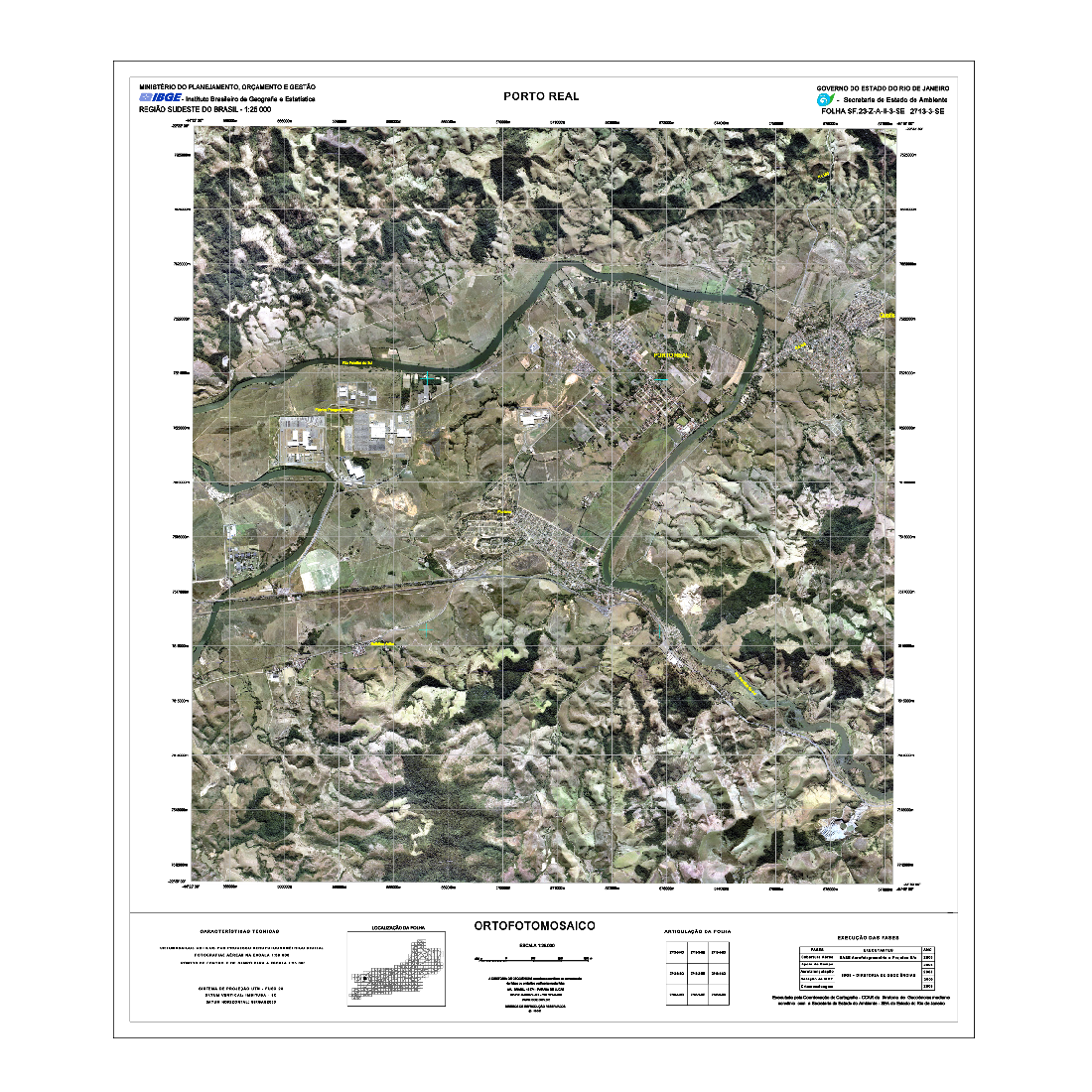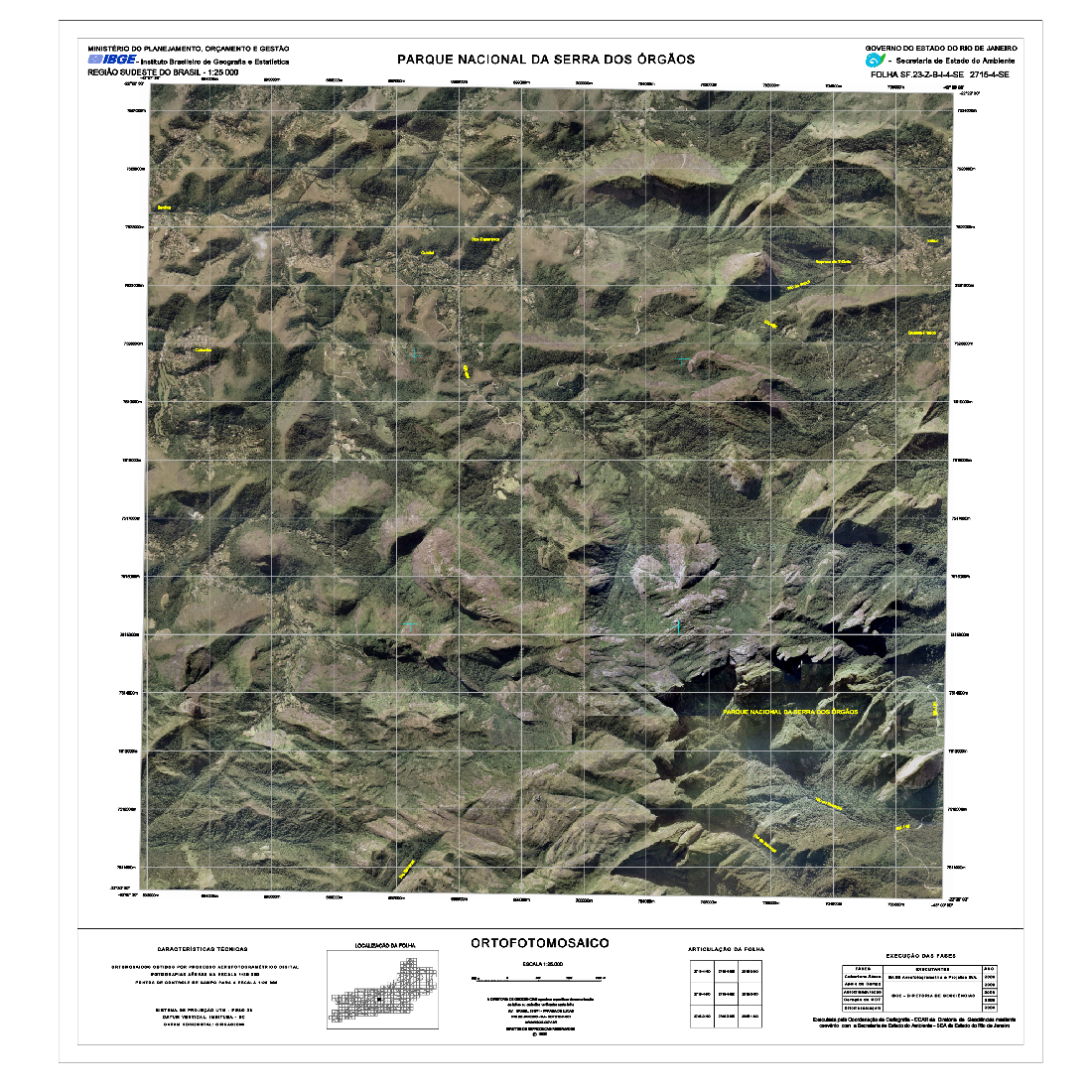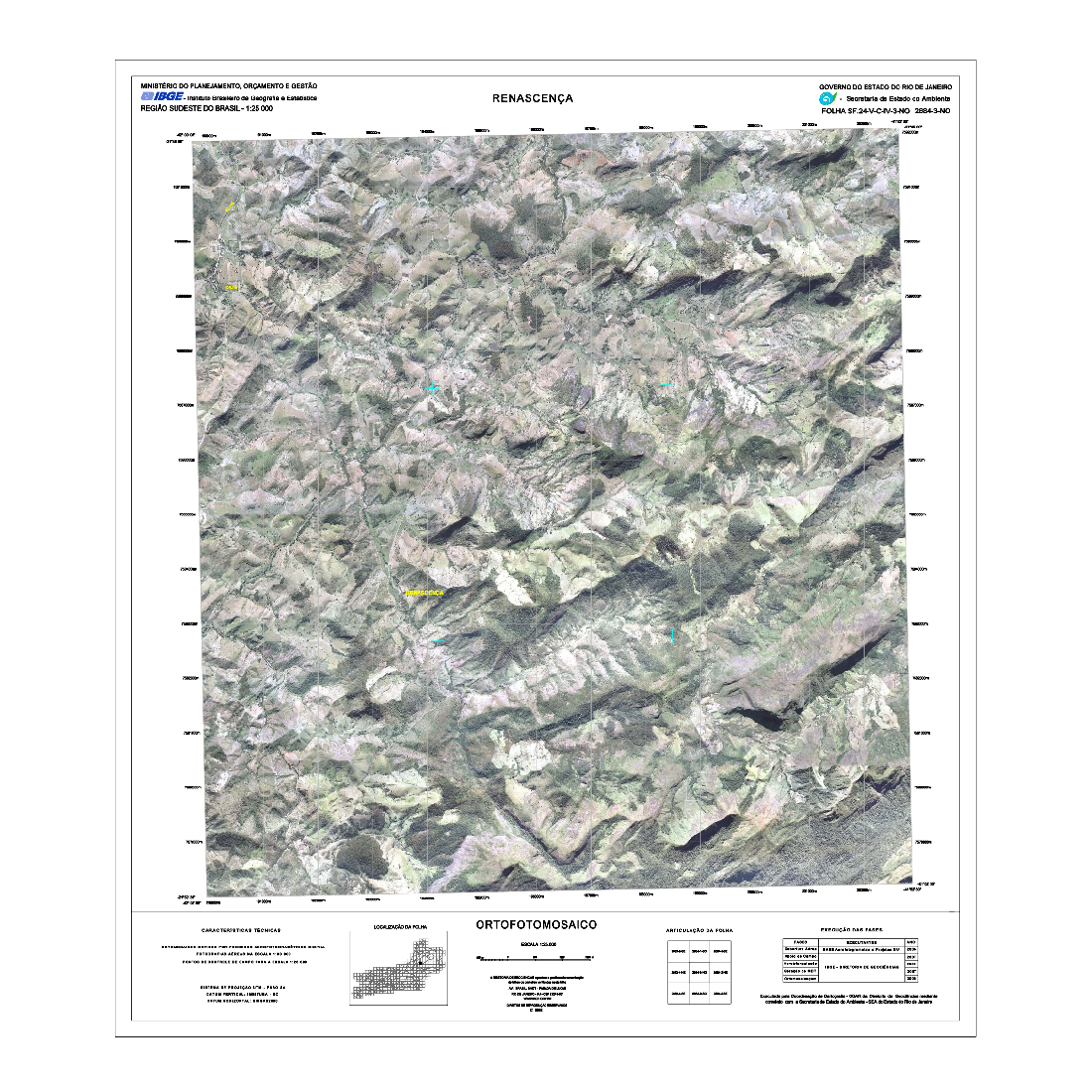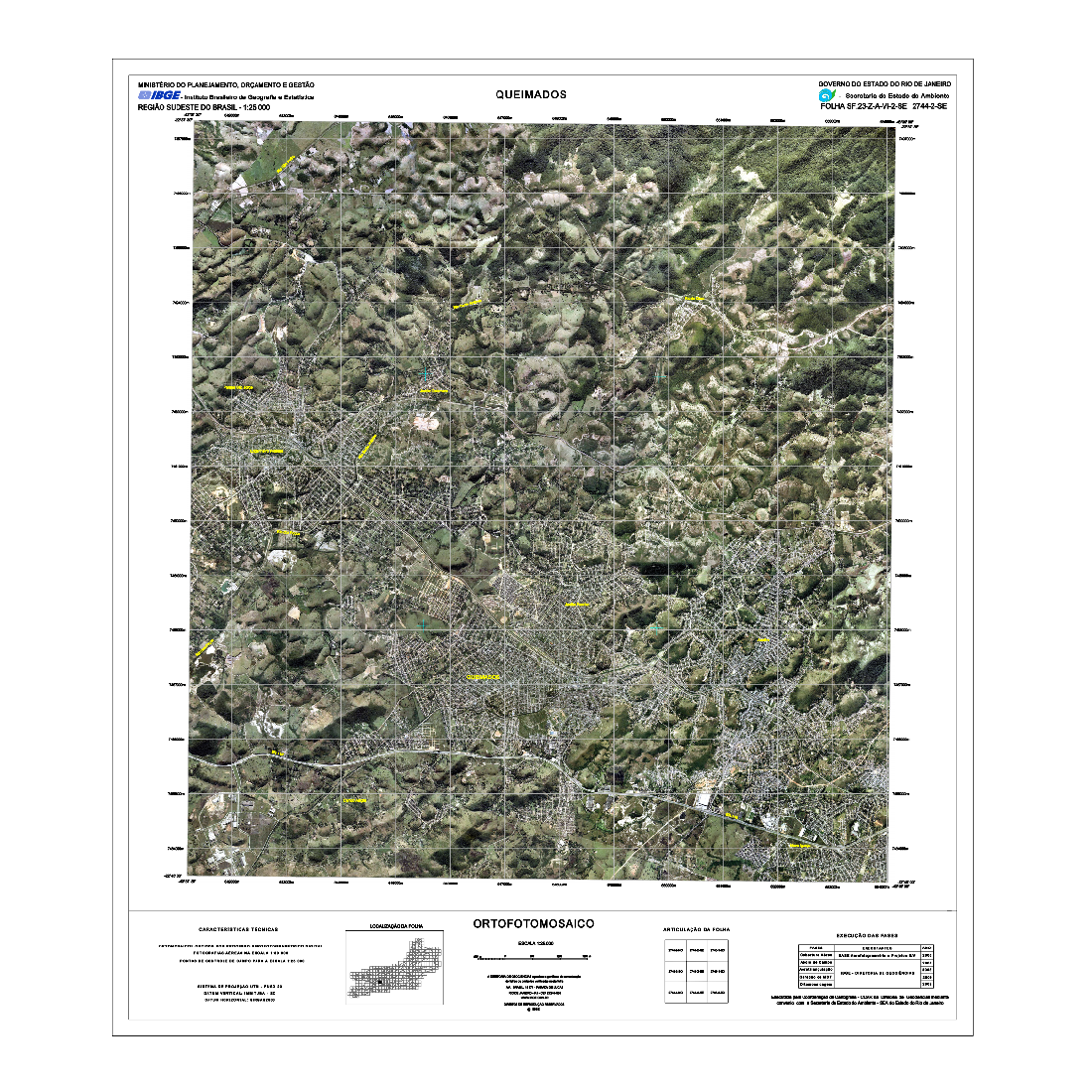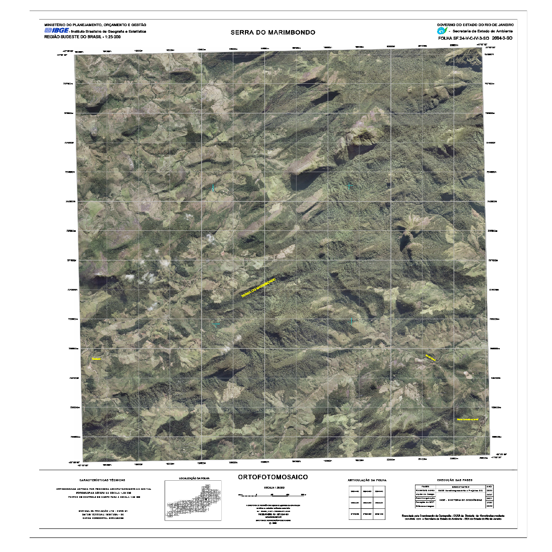 As Cartas Imagens do estado do Rio de Janeiro correspondem a um tipo de representação cartográfica constituída por mosaicos de fotografias aéreas coloridas ortorretificadas, com nomes geográficos e informações marginais, obedecendo ao recorte das folhas do Mapeamento Sistemático Terrestre na escala de 1:25.000. Este produto possui propriedades geométricas de uma folha topográfica. As Cartas Imagens integram o projeto "Rio de Janeiro 1:25.000" (RJ25). Fotografias aéreas obtidas a partir de aerolevantamento executado pela empresa Base Aerofotogrametria e Projetos S.A, com escala aproximada de 1:30.000 e resolução de 0,7m. Para a obtenção das fotografias aéreas foi utilizada câmera Zeiss RMK Top 15, com distância focal 152.749mm. Posteriormente, foram mosaicadas segundo o recorte de folhas do mapeamento sistemático brasileiro, com a resolução final de 1m, utilizando o aplicativo LPS, da empresa ERDAS. O processo de aerotriangulação foi realizado em blocos e o resultado final do ajustamento ficou entre 3 e 7 m, compatível com a escala final de trabalho.