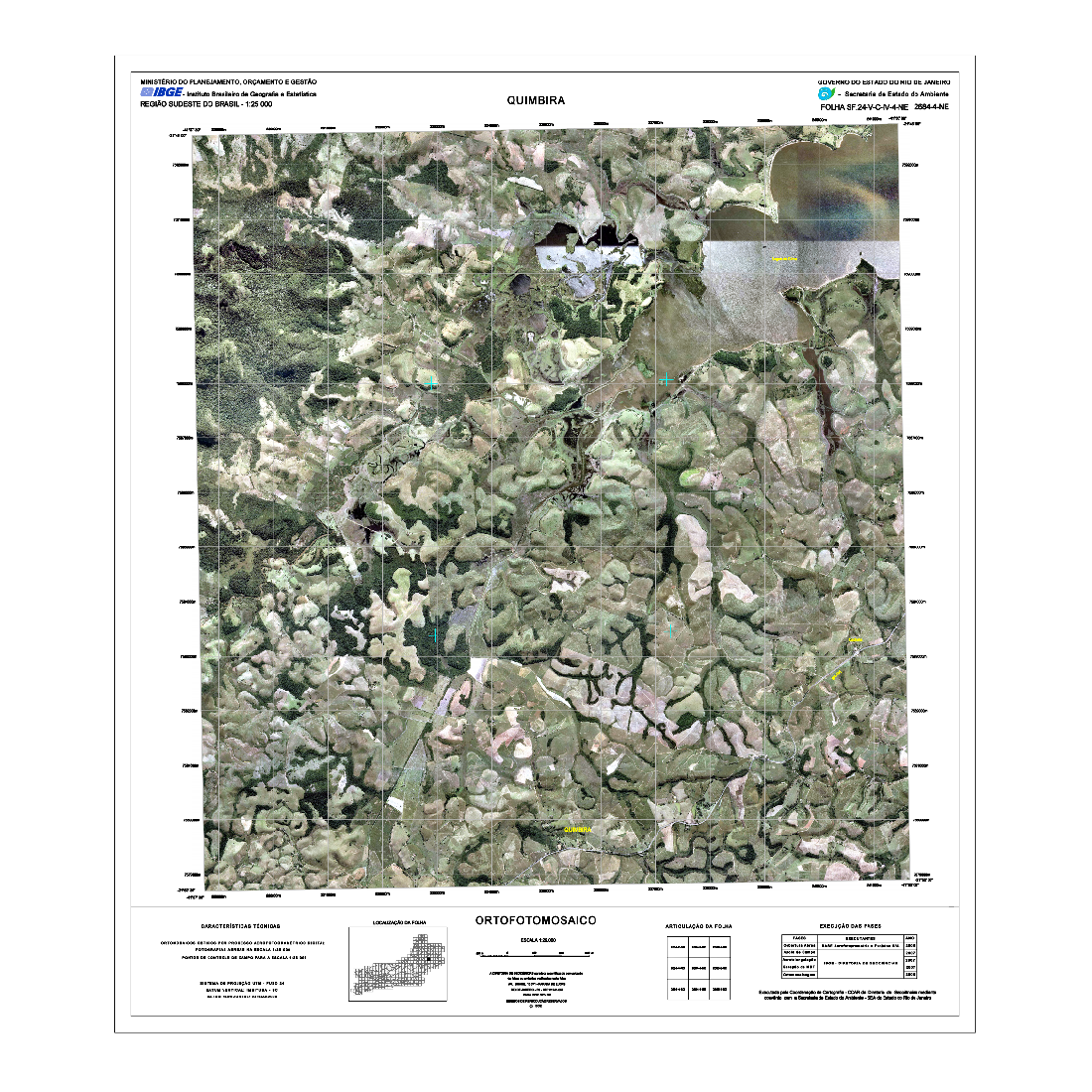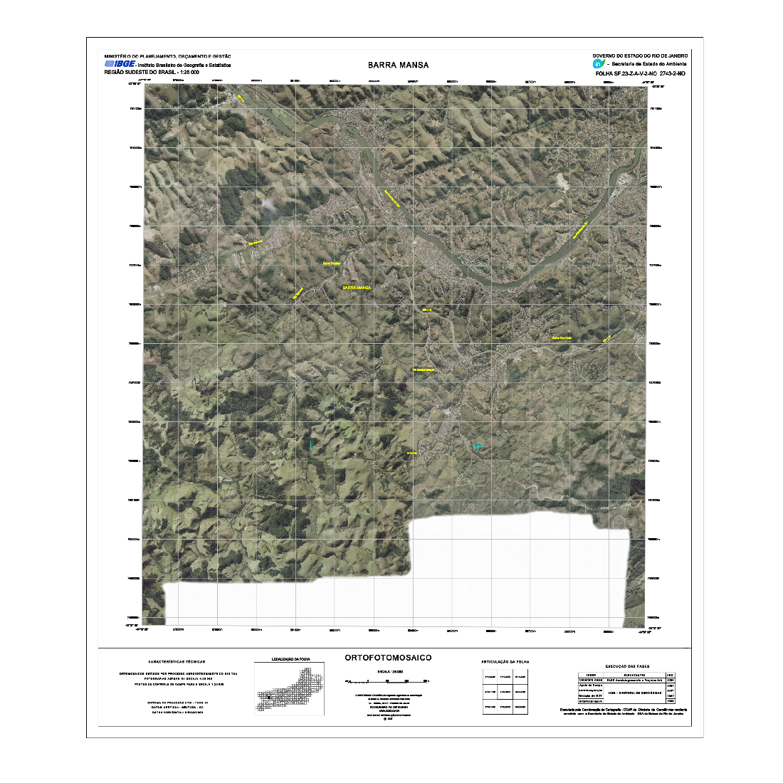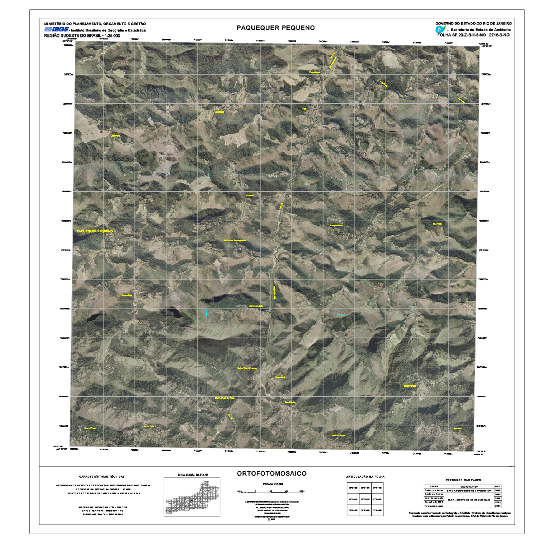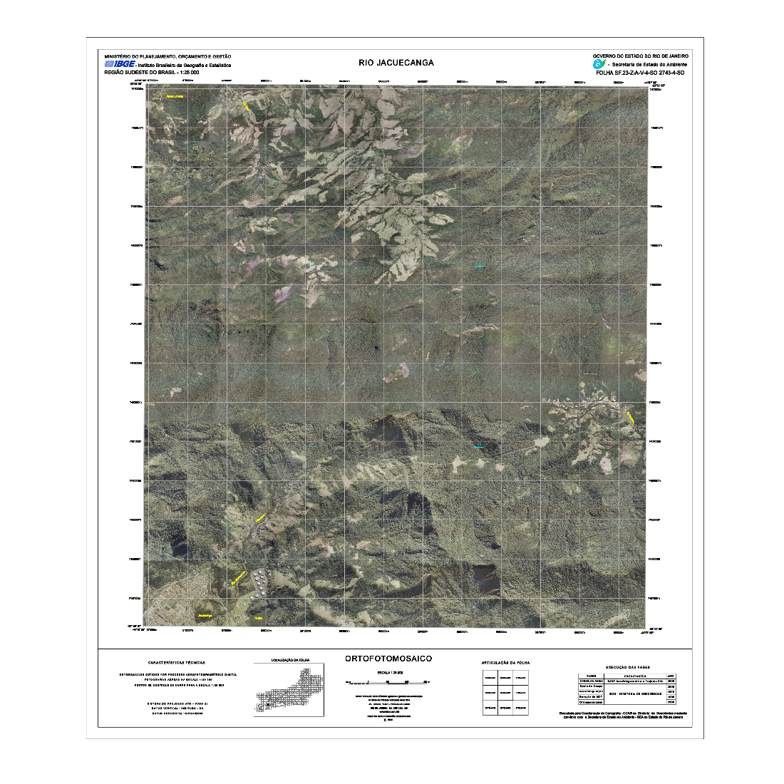 As Cartas Imagens do estado do Rio de Janeiro correspondem a um tipo de representação cartográfica constituída por mosaicos de fotografias aéreas coloridas ortorretificadas, com nomes geográficos e informações marginais, obedecendo ao recorte das folhas do Mapeamento Sistemático Terrestre na escala de 1:25.000. Este produto possui propriedades geométricas de uma folha topográfica. As Cartas Imagens integram o projeto "Rio de Janeiro 1:25.000" (RJ25). Fotografias aéreas obtidas a partir de aerolevantamento executado pela empresa Base Aerofotogrametria e Projetos S.A, com escala aproximada de 1:30.000 e resolução de 0,7m. Para a obtenção das fotografias aéreas foi utilizada câmera Zeiss RMK Top 15, com distância focal 152.749mm. Posteriormente, foram mosaicadas segundo o recorte de folhas do mapeamento sistemático brasileiro, com a resolução final de 1m, utilizando o aplicativo LPS, da empresa ERDAS. O processo de aerotriangulação foi realizado em blocos e o resultado final do ajustamento ficou entre 3 e 7 m, compatível com a escala final de trabalho.
