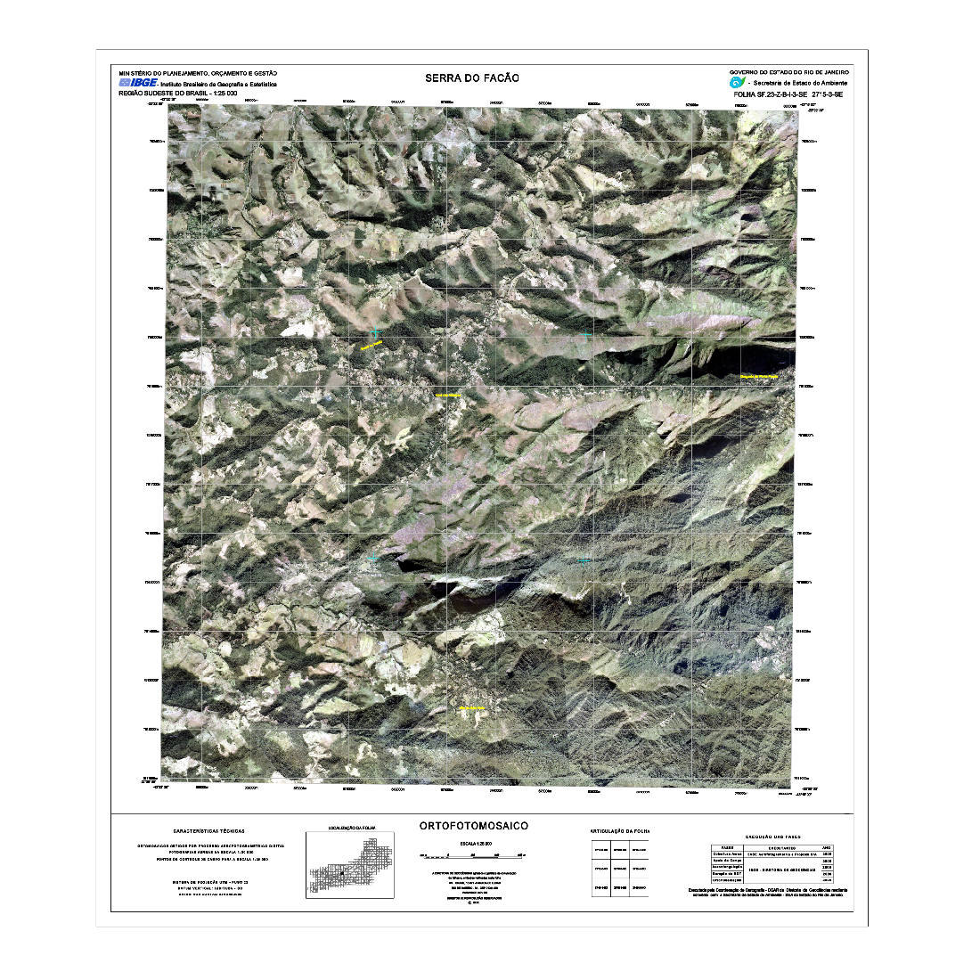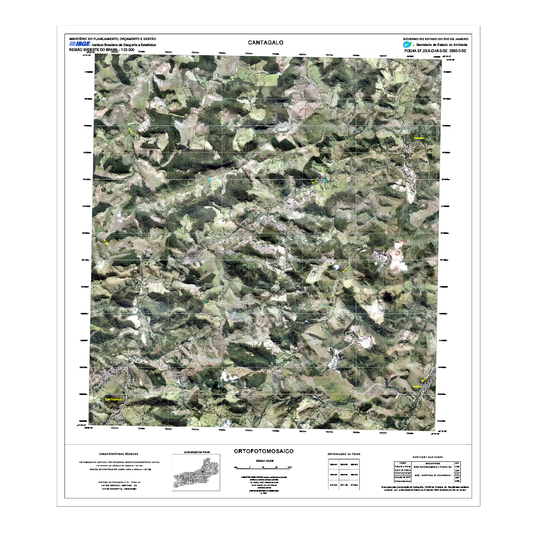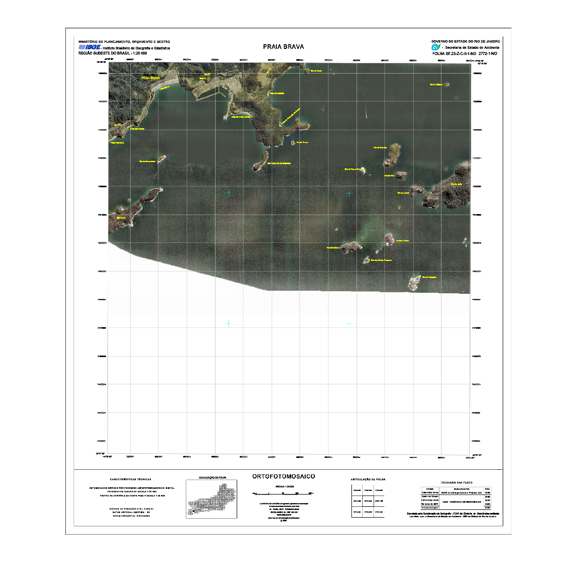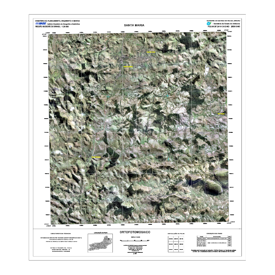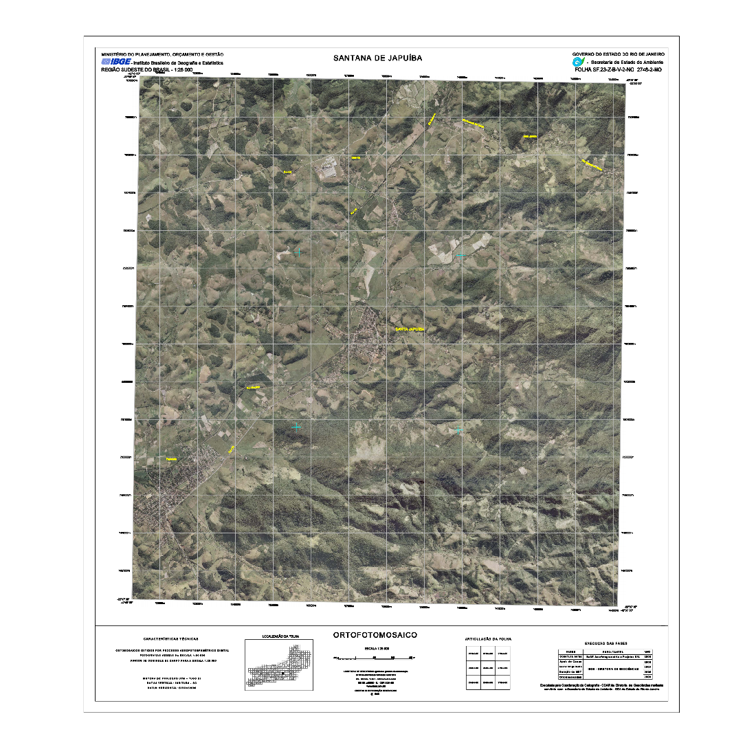 As Cartas Imagens do estado do Rio de Janeiro correspondem a um tipo de representação cartográfica constituída por mosaicos de fotografias aéreas coloridas ortorretificadas, com nomes geográficos e informações marginais, obedecendo ao recorte das folhas do Mapeamento Sistemático Terrestre na escala de 1:25.000. Este produto possui propriedades geométricas de uma folha topográfica. As Cartas Imagens integram o projeto "Rio de Janeiro 1:25.000" (RJ25). Fotografias aéreas obtidas a partir de aerolevantamento executado pela empresa Base Aerofotogrametria e Projetos S.A, com escala aproximada de 1:30.000 e resolução de 0,7m. Para a obtenção das fotografias aéreas foi utilizada câmera Zeiss RMK Top 15, com distância focal 152.749mm. Posteriormente, foram mosaicadas segundo o recorte de folhas do mapeamento sistemático brasileiro, com a resolução final de 1m, utilizando o aplicativo LPS, da empresa ERDAS. O processo de aerotriangulação foi realizado em blocos e o resultado final do ajustamento ficou entre 3 e 7 m, compatível com a escala final de trabalho.