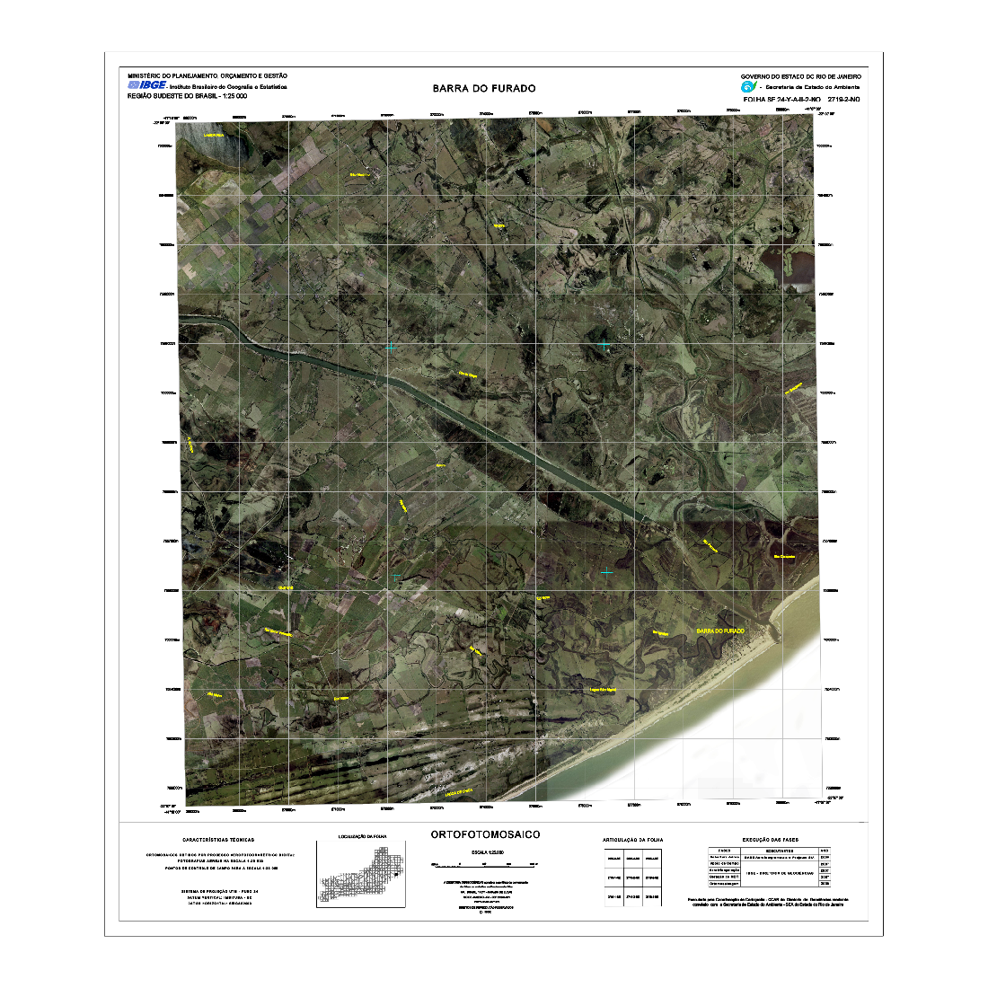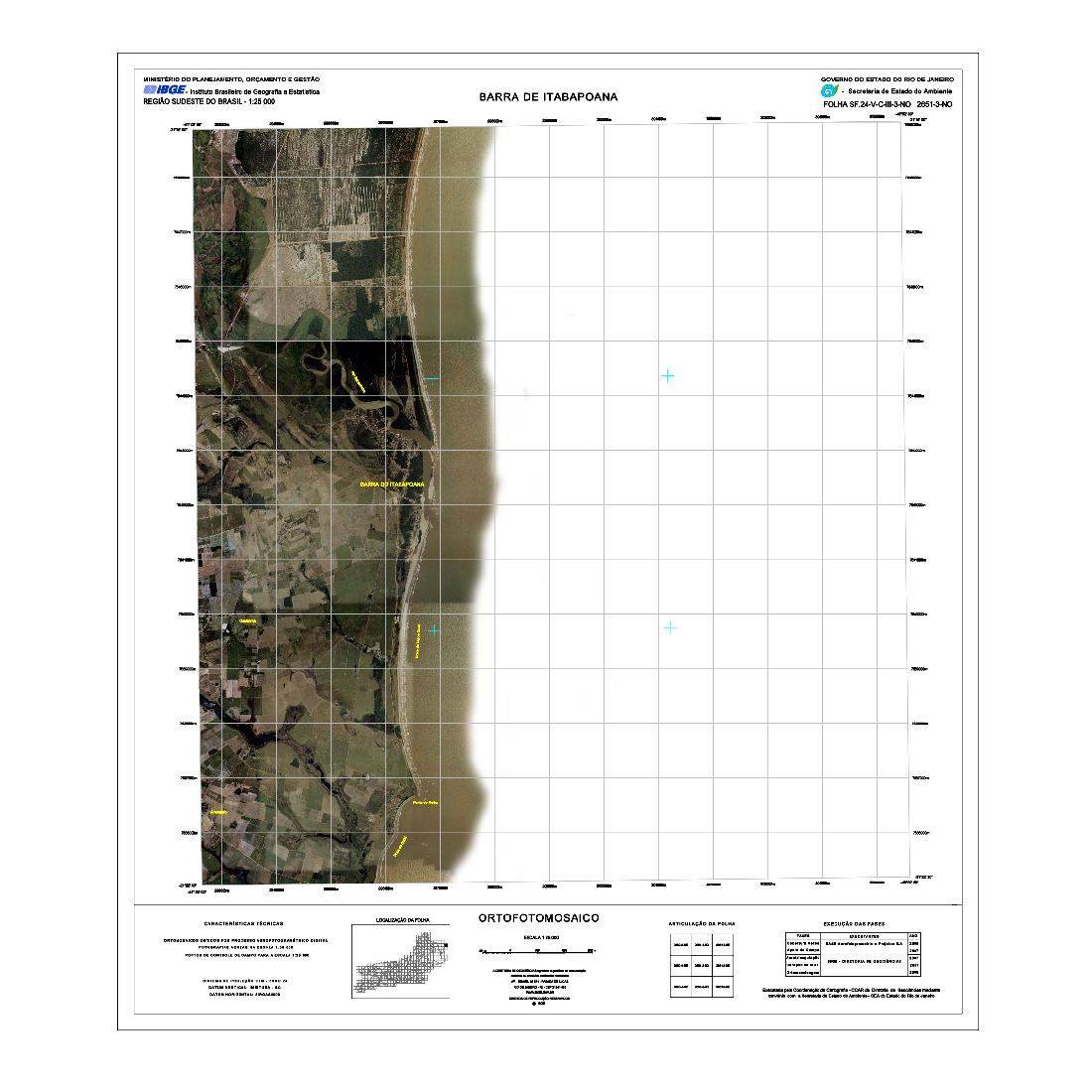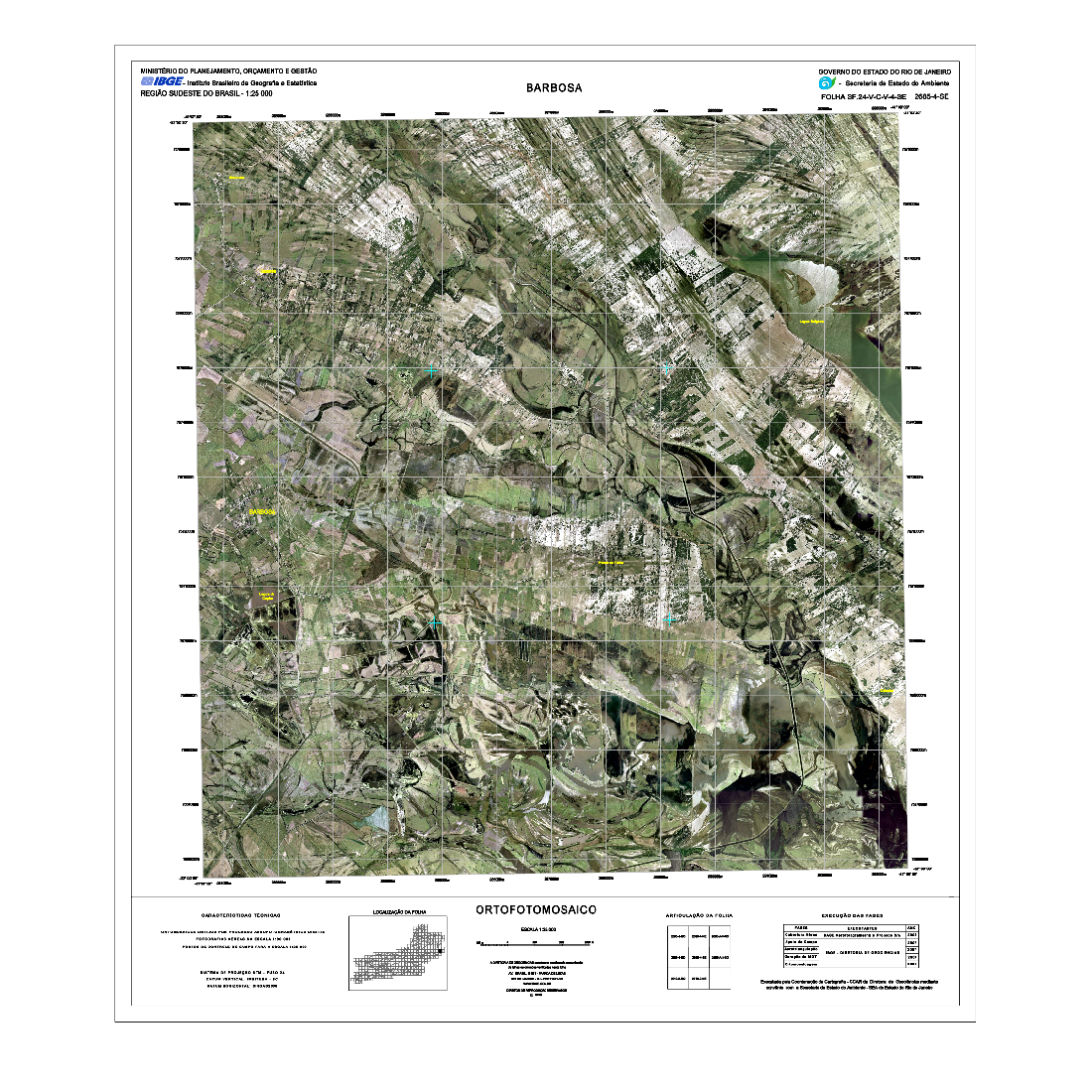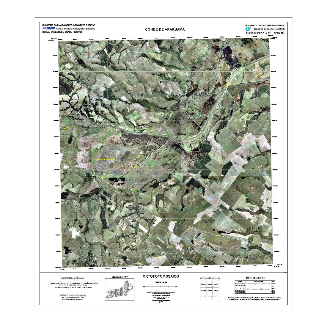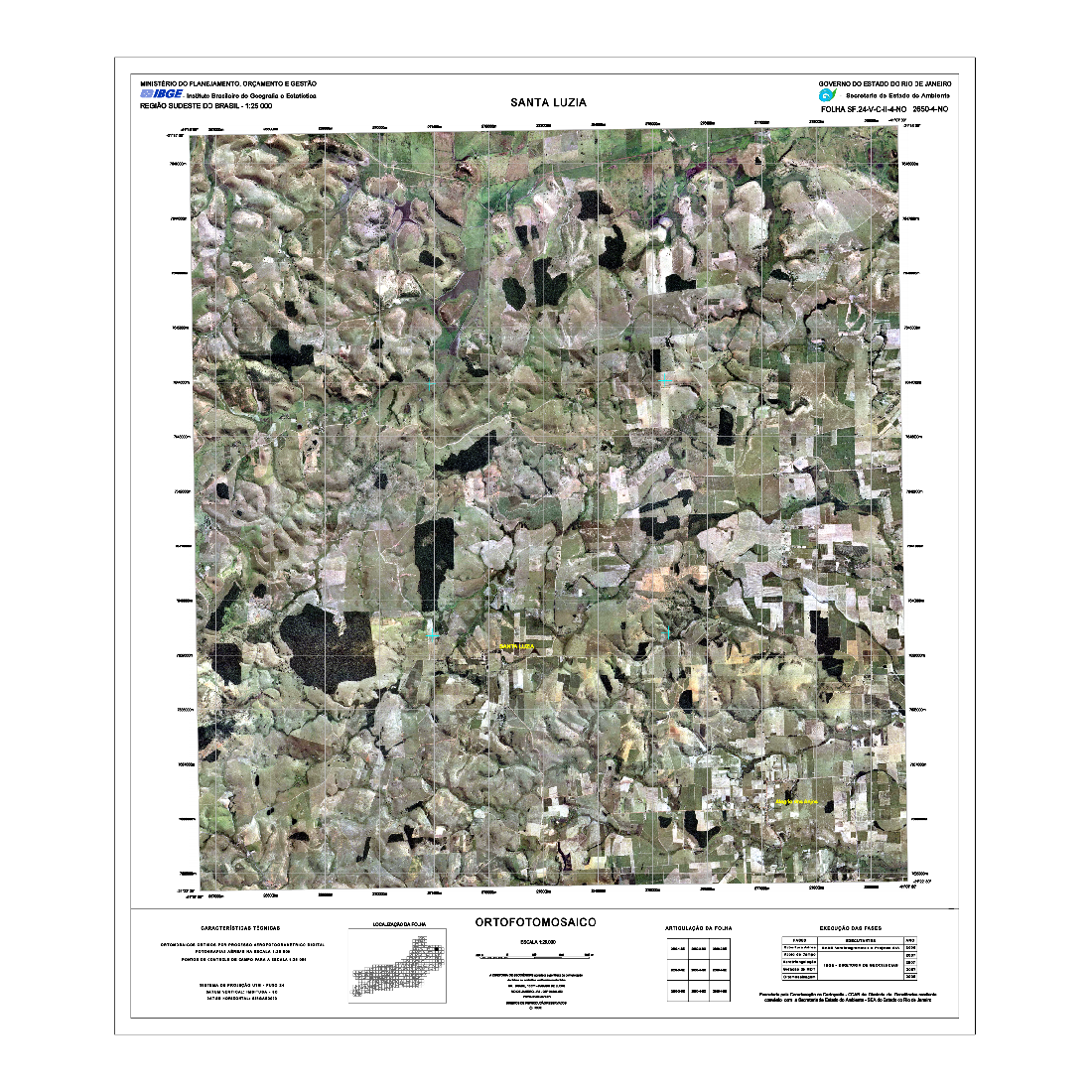 As Cartas Imagens do estado do Rio de Janeiro correspondem a um tipo de representação cartográfica constituída por mosaicos de fotografias aéreas coloridas ortorretificadas, com nomes geográficos e informações marginais, obedecendo ao recorte das folhas do Mapeamento Sistemático Terrestre na escala de 1:25.000. Este produto possui propriedades geométricas de uma folha topográfica. As Cartas Imagens integram o projeto "Rio de Janeiro 1:25.000" (RJ25). Fotografias aéreas obtidas a partir de aerolevantamento executado pela empresa Base Aerofotogrametria e Projetos S.A, com escala aproximada de 1:30.000 e resolução de 0,7m. Para a obtenção das fotografias aéreas foi utilizada câmera Zeiss RMK Top 15, com distância focal 152.749mm. Posteriormente, foram mosaicadas segundo o recorte de folhas do mapeamento sistemático brasileiro, com a resolução final de 1m, utilizando o aplicativo LPS, da empresa ERDAS. O processo de aerotriangulação foi realizado em blocos e o resultado final do ajustamento ficou entre 3 e 7 m, compatível com a escala final de trabalho.