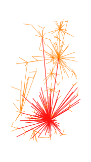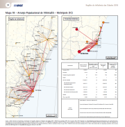 Geoserviço exibindo detalhamento da rede do AP Porto Alegre (RS) - Metrópole (1C) e suas interações. Estrutura da rede, indicando vínculo direto ao centro principal em vermelho, vínculos a centros secundários em laranja. IBGE, Diretoria de Geociências, Coordenação de Geografia, Regiões de Influência das Cidades, 2018