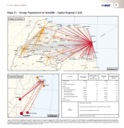 Geoserviço exibindo detalhamento da rede do AP Juíz de Fora (MG) - Capital Regional B (2B) e suas interações. Estrutura da rede, indicando vínculo direto ao centro principal em vermelho, vínculos a centros secundários em laranja. IBGE, Diretoria de Geociências, Coordenação de Geografia, Regiões de Influência das Cidades, 2018