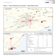 Mapa exibindo detalhamento da estrutura da rede do AP Sorocaba (SP) - Capital Regional B (2B) e suas interações. O primeiro mapa, região de influência, destaca a estrutura da rede, indicando conexões diretas ao centro principal e conexões mediadas por um centro secundário. No mesmo mapa está representada a hierarquia dos centros pertencentes a rede e daqueles a ela adjacentes. Além disto, estão apresentadas, em cinza, todas as ligações dos centros acima do nível local. O segundo mapa, de conexões externas, apresenta ligações de centros superiores ao nível local, externos à região de influência da Metrópole ou Capital Regional em questão. IBGE, Diretoria de Geociências, Coordenação de Geografia, Regiões de Influência das Cidades, 2018; IBGE, Diretoria de Geociências, Áreas dos municípios, 2018; IBGE, Diretoria de Pesquisas, Estimativas da população, 2018; IBGE, Diretoria de Pesquisas, Produto Interno Bruto dos Municípios, 2016.