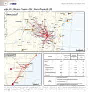 Geoserviço exibindo detalhamento da rede de Itabuna (BA) - Capital Regional B (2B) e suas interações. Estrutura da rede, indicando vínculo direto ao centro principal em vermelho, vínculos a centros secundários em laranja. IBGE, Diretoria de Geociências, Coordenação de Geografia, Regiões de Influência das Cidades, 2018