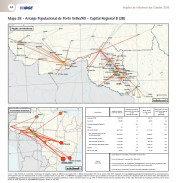 Mapa exibindo detalhamento da estrutura da rede do AP Porto Velho (RO) - Capital Regional B (2B) e suas interações. O primeiro mapa, região de influência, destaca a estrutura da rede, indicando conexões diretas ao centro principal e conexões mediadas por um centro secundário. No mesmo mapa está representada a hierarquia dos centros pertencentes a rede e daqueles a ela adjacentes. Além disto, estão apresentadas, em cinza, todas as ligações dos centros acima do nível local. O segundo mapa, de conexões externas, apresenta ligações de centros superiores ao nível local, externos à região de influência da Metrópole ou Capital Regional em questão. IBGE, Diretoria de Geociências, Coordenação de Geografia, Regiões de Influência das Cidades, 2018; IBGE, Diretoria de Geociências, Áreas dos municípios, 2018; IBGE, Diretoria de Pesquisas, Estimativas da população, 2018; IBGE, Diretoria de Pesquisas, Produto Interno Bruto dos Municípios, 2016.