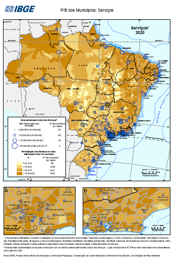"Conjunto de Mapas exibindo a o valor bruto e a participação dos demais serviços no valor adicionado bruto municipal Estatísticas macroeconômicas. Dados por município. Período de referência 01/01/2019 a 31/12/2019.Compreende as atividades Transporte, armazenagem e correio; Alojamento e alimentação; Informação e comunicação; Atividades financeiras, de seguros e serviços relacionados; Atividades imobiliárias; Atividades profissionais, científicas e técnicas, administrativas e serviços complementares; Educação e saúde privadas e Outras atividades de serviços. Contas Nacionais Periodicidade anual IBGE, Produto Interno Bruto dos Municípios. Diretoria de Pesquisas, Coordenação de Contas Nacionais e Diretoria de Geociências, Coordenação de Geografia. IBGE, Malha Municipal 2018"
