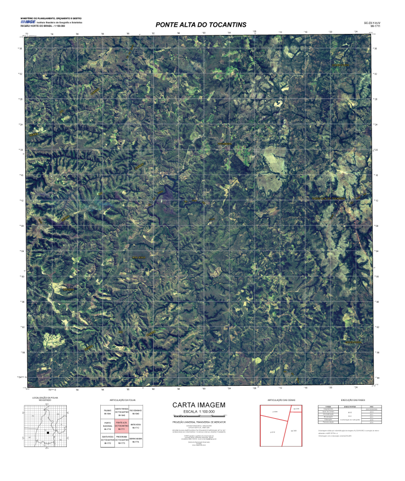 As Cartas Imagens do estado do Tocantins correspondem a um tipo de representação cartográfica constituída por mosaico de imagens de satélite ortorretificadas, com nomes geográficos e informações marginais, obedecendo ao recorte das folhas do Mapeamento Sistemático Terrestre na escala de 1:100.00, onde 1cm=1km. Este produto possui propriedades geométricas de uma folha topográfica.As Cartas Imagens integram o projeto "Base Cartográfica 1:100.000" (BC100), e foram produzidas a partir de imagens do sensor AVNIR-2, com 10 metros de resolução espacial, adquiridas entre os anos de 2006 e 2010, sendo 91% delas nos anos de 2009 e 2010.