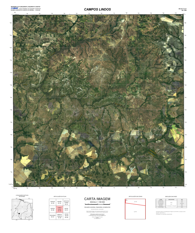 As Cartas Imagens dos estados do Tocantins e do Piauí correspondem a um tipo de representação cartográfica constituída por mosaico de imagens de satélite ortorretificadas, com nomes geográficos e informações marginais, obedecendo ao recorte das folhas do Mapeamento Sistemático Terrestre na escala de 1:100.00, onde 1cm=1km. Este produto possui propriedades geométricas de uma folha topográfica. As Cartas Imagens integram o projeto "Base Cartográfica 1:100.000" (BC100), e foram produzidas a partir de imagens do sensor AVNIR-2, com 10 metros de resolução espacial, adquiridas entre os anos de 2006 e 2010, sendo 91% delas nos anos de 2009 e 2010.