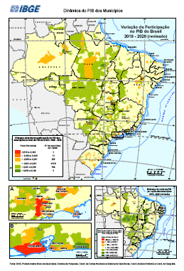 "Conjunto de mapas exibindo a diferença entre a participação do PIB do município no total do PIB do Brasil em 2020 e a participação do PIB do mesmo município do PIB do Brasil em 2019 em pontos percentuais e exibindo a diferença da razão do PIB per capita do município ante o PIB per capita do Brasil em 2020 e a razão do PIB per capita do mesmo município ante o PIB per capita do Brasil em 2019 em número índice (PIB per capita do Brasil = 100) Estatísticas macroeconômicas. Dados por município. Períodos de referência 01/01/2019 a 31/12/2019 e 01/01/2020 a 31/12/2020. Para o cálculo foi utilizada a População residente estimada para 1º de julho de 2019 e 2020, segundo os municípios, enviada ao Tribunal de Contas da União – TCU. Dados em R$ por pessoa Contas Nacionais Periodicidade anual IBGE, Produto Interno Bruto dos Municípios. Diretoria de Pesquisas, Coordenação de Contas Nacionais e Diretoria de Geociências, Coordenação de Meio Ambiente. IBGE, Malha Municipal 2020"