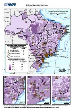 "Conjunto de Mapas exibindo a o valor bruto e a participação do comércio no valor adicionado bruto municipal Estatísticas macroeconômicas. Dados por município. Período de referência 01/01/2021 a 31/12/2021. Contas Nacionais Periodicidade anual IBGE, Produto Interno Bruto dos Municípios. Diretoria de Pesquisas, Coordenação de Contas Nacionais e Diretoria de Geociências, Coordenação de Geografia. IBGE, Malha Municipal 2021"
