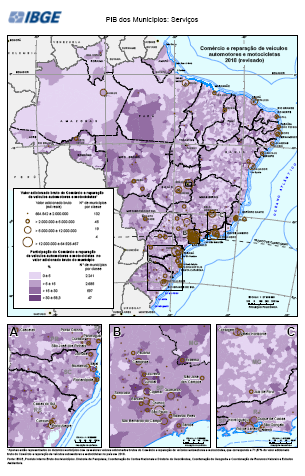 "Conjunto de Mapas exibindo a o valor bruto e a participação do comércio no valor adicionado bruto municipal Estatísticas macroeconômicas. Dados por município. Período de referência 01/01/2018 a 31/12/2018. Contas Nacionais Periodicidade anual IBGE, Produto Interno Bruto dos Municípios. Diretoria de Pesquisas, Coordenação de Contas Nacionais e Diretoria de Geociências, Coordenação de Geografia. IBGE, Malha Municipal 2018"