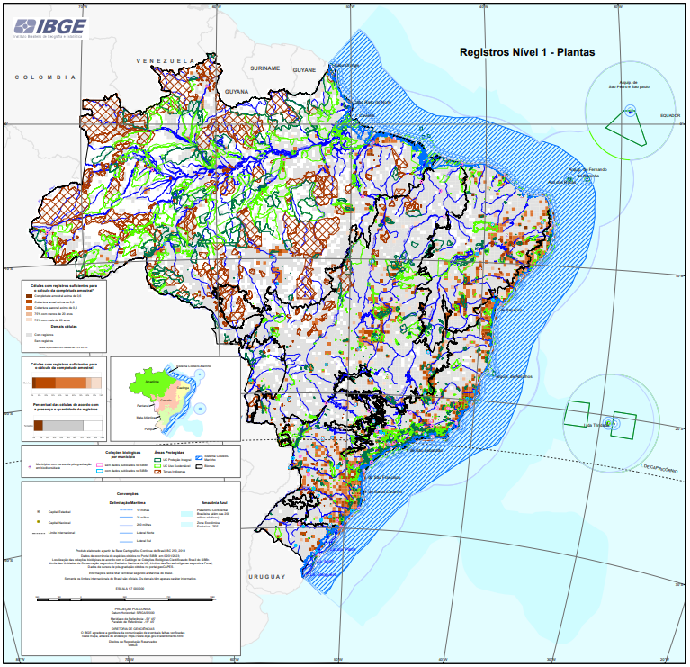 Dado originado da publicação: Avaliação dos dados sobre a biodiversidade brasileira 2022. Elaborado na grade estatística com resolução de 25 km x 25 km. Apresenta a caracterização das células em sete categorias indicativas do nível de cobertura dos registros de ocorrência de plantas, considerando a quantidade, idade, distribuição temporal e completude amostral. Camadas adicionais foram acrescentadas para contextualizar as informações: Unidades de Conservação 2022, Terras Indígenas 2020. biomas, Sistema Costeiro-Marinho, Municípios com coleções biológicas e Municípios com Programa de Pós- Graduação em Biodiversidade.