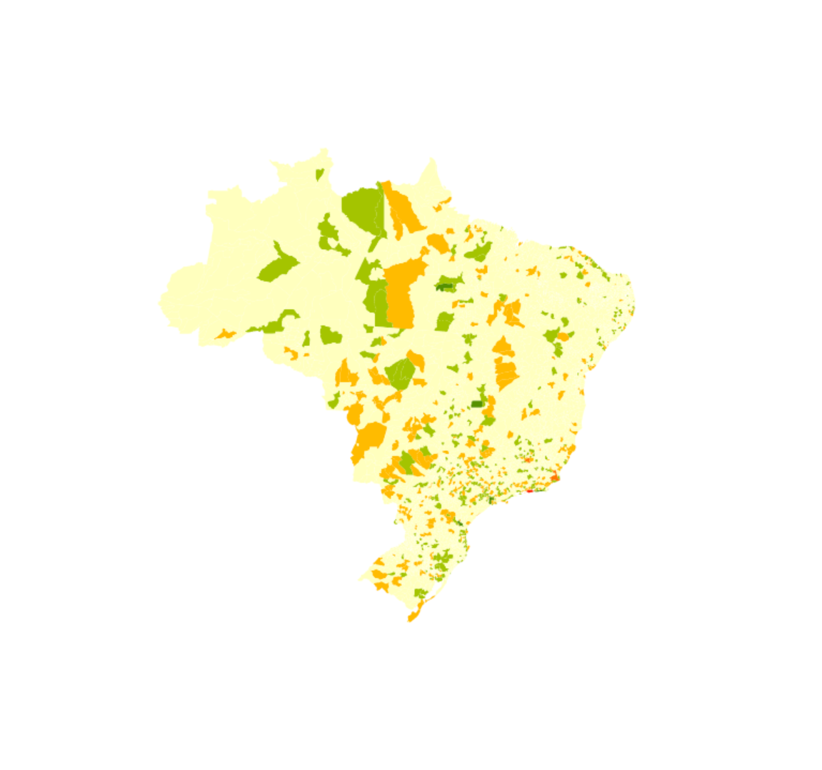"Mapa exibindo a diferença entre a participação do PIB do município no total do PIB do Brasil em 2023 e a participação do PIB do mesmo município do PIB do Brasil em 2002 em pontos percentuais Estatísticas macroeconômicas. Dados por município. Períodos de referência 01/01/2002 a 31/12/2002 e 01/01/2023 a 31/12/2023. Contas Nacionais Periodicidade anual IBGE, Produto Interno Bruto dos Municípios. Diretoria de Pesquisas, Coordenação de Contas Nacionais e Diretoria de Geociências, Coordenação de Geografia. IBGE, Malha Municipal 2023"