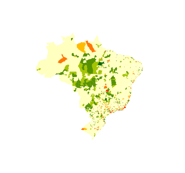 "Mapa exibindo a diferença entre a participação do PIB do município no total do PIB do Brasil em 2017 e a participação do PIB do mesmo município do PIB do Brasil em 2002 em pontos percentuais Estatísticas macroeconômicas. Dados por município. Períodos de referência 01/01/2002 a 31/12/2002 e 01/01/2017 a 31/12/2017. Contas Nacionais Periodicidade anual IBGE, Produto Interno Bruto dos Municípios. Diretoria de Pesquisas, Coordenação de Contas Nacionais e Diretoria de Geociências, Coordenação de Geografia. IBGE, Malha Municipal 2018"