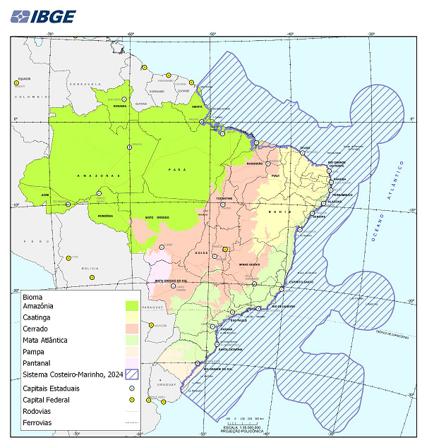 O produto Biomas e Sistema Costeiro-Marinho do Brasil: compatível com a escala 1:250 000, publicado em 2019, denota um dos compromissos do IBGE em atualizar sistematicamente seus dados e informações. Visando aprimorar a delimitação dos Biomas brasileiros, alterou-se trechos dos limites entre a Mata Atlântica e o Cerrado como uma primeira revisão. De forma geral, os biomas eram delimitados tendo por base as fitofisionomias do Mapa de Vegetação do Brasil na mesma escala. No presente produto, os mesmos foram definidos a partir da integração das informações oriundas dos demais temas em recursos naturais, produzidos pelo IBGE, a saber: geologia, geomorfologia, pedologia, além de dados climáticos. Essa revisão busca atender às expectativas de diferentes setores da sociedade interessados em um mapeamento mais fidedigno dos recursos naturais do País. O Mapa de Biomas e Sistema Costeiro-Marinho do Brasil, compatível com a escala 1:250 000, traz os limites entre os seis Biomas brasileiros, Amazônia, Mata Atlântica, Caatinga, Cerrado, Pantanal, Pampa e o Sistema Costeiro-Marinho, cuja parte continental se sobrepõe aos Biomas limitantes à costa brasileira, em sua parte leste é adequado à Amazônia Azul (publicado em 2024).