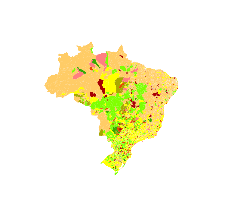 "Mapa exibindo a Maior atividade econômica no total do valor adicionado bruto muncipal Estatísticas macroeconômicas. Dados por município. Período de referência 01/01/2019 a 31/12/2019. Contas Nacionais Periodicidade anual IBGE, Produto Interno Bruto dos Municípios. Diretoria de Pesquisas, Coordenação de Contas Nacionais e Diretoria de Geociências, Coordenação de Geografia. IBGE, Malha Municipal 2018"